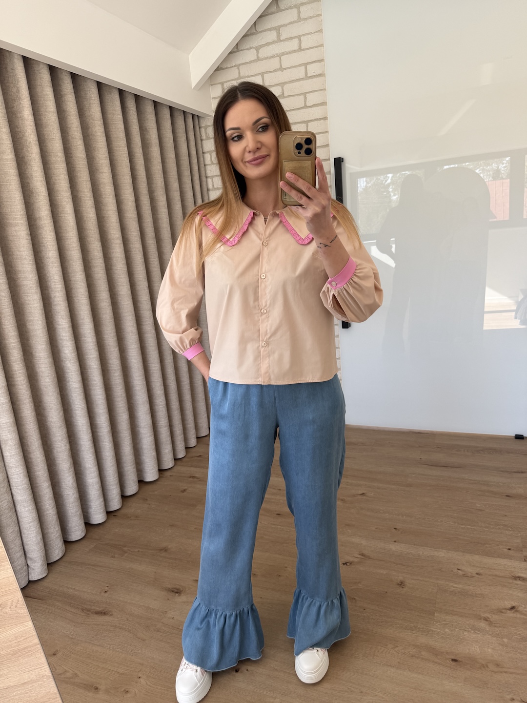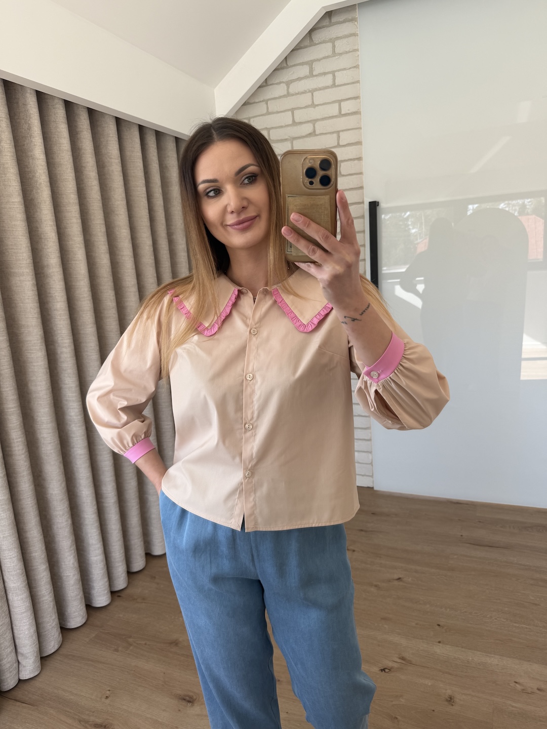 Bawełniana koszula z kołnierzykiem wykończonym koronką - beżowa