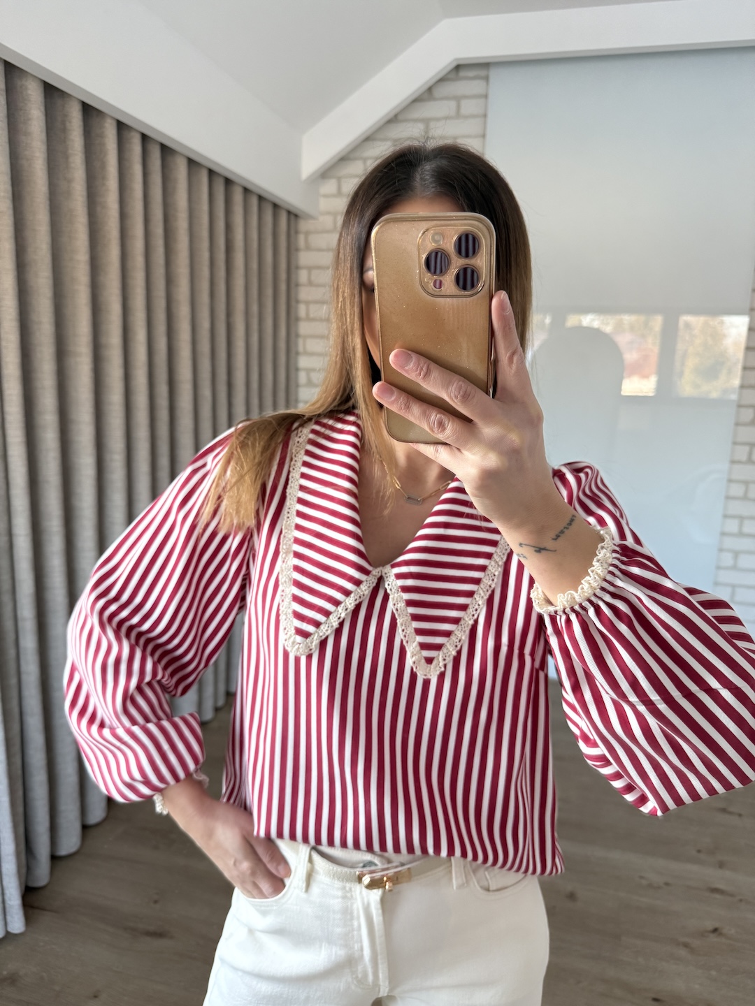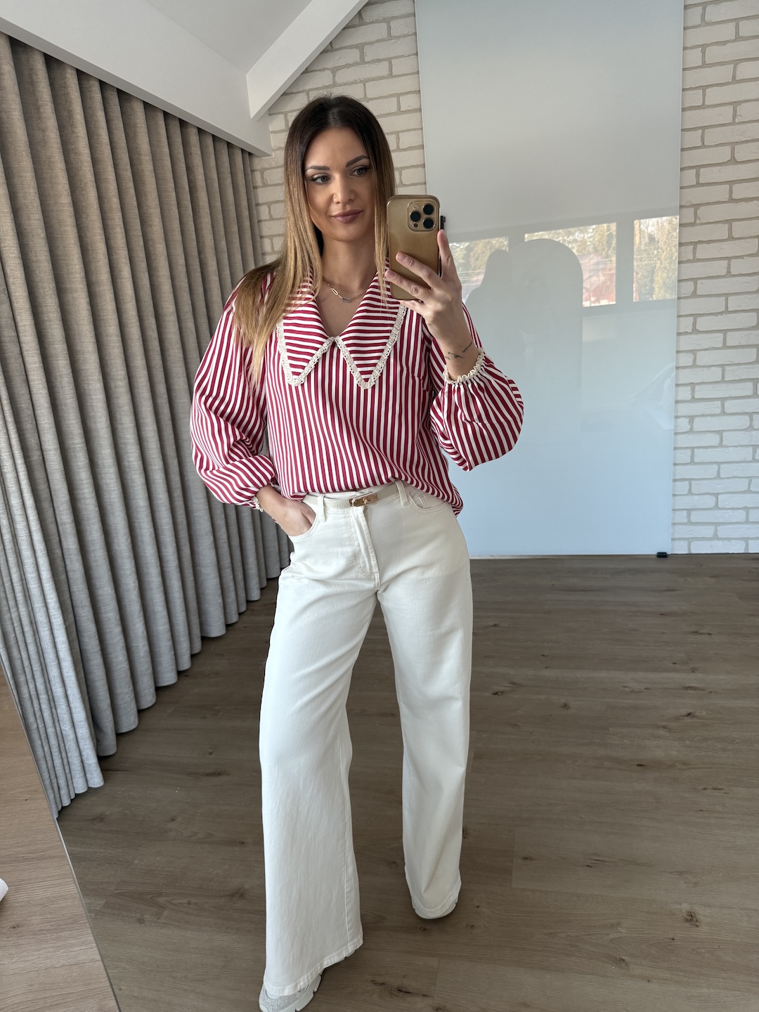 Wiskozowa koszula z kołnierzykiem wykończonym koronką - czerwona w paski