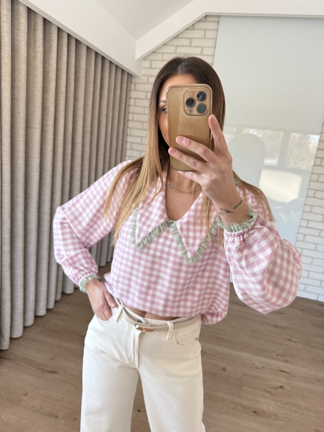 Wiskozowa koszula z kołnierzykiem wykończonym koronką - różowa kratka