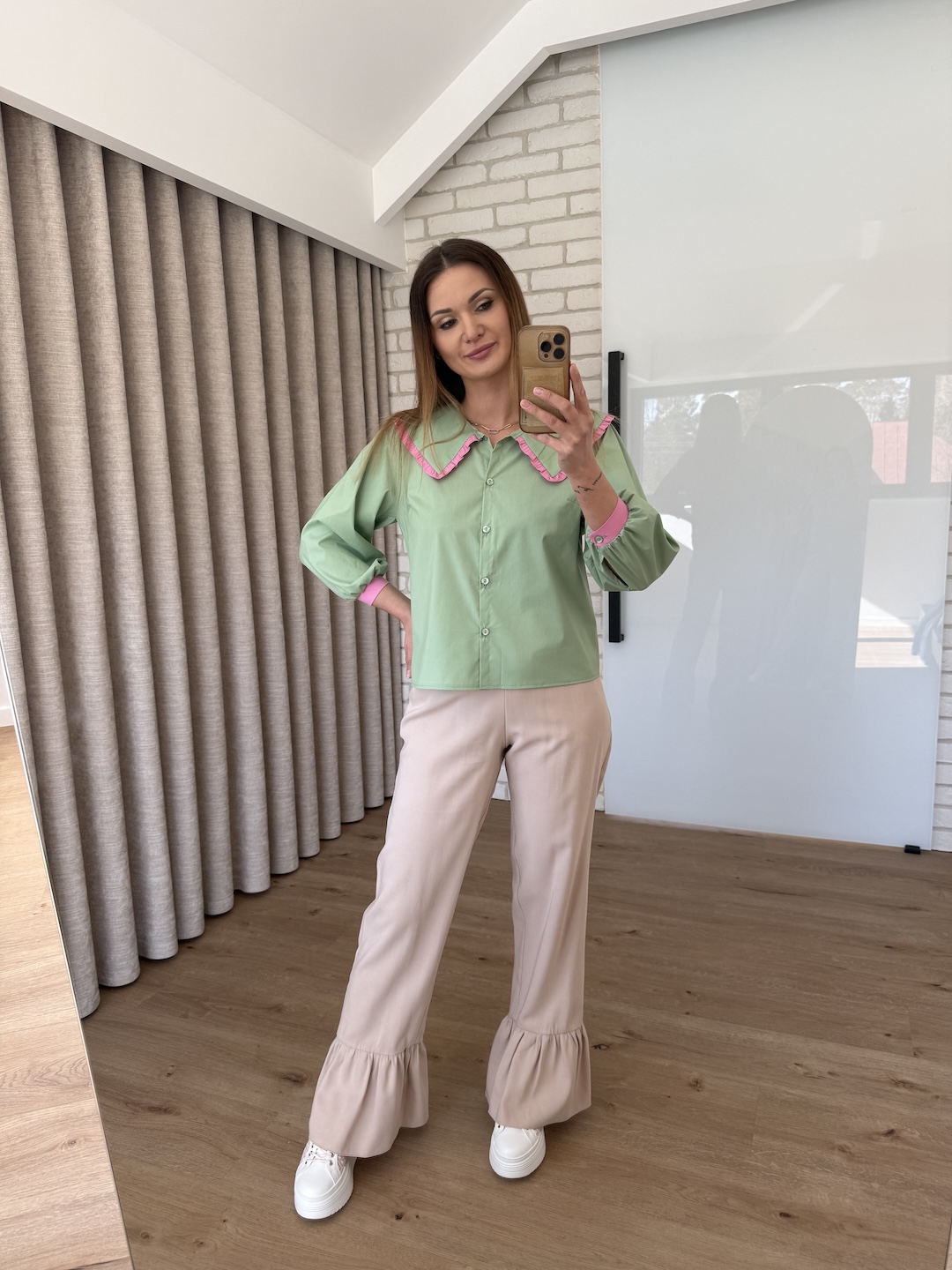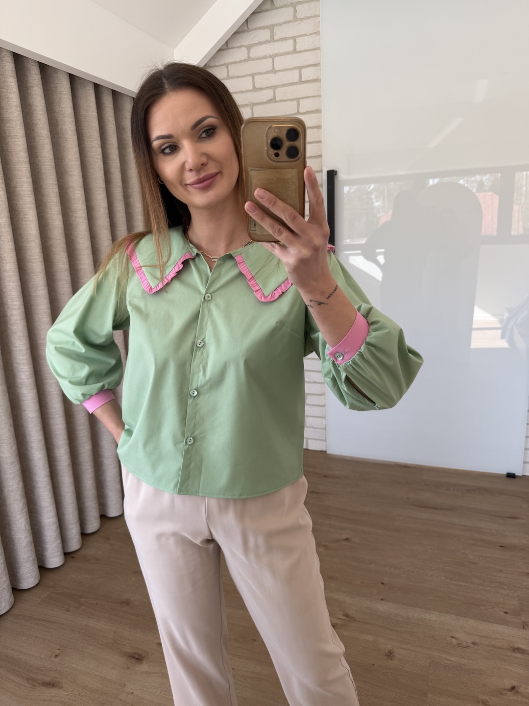 Bawełniana koszula z kołnierzykiem wykończonym koronką - zielona