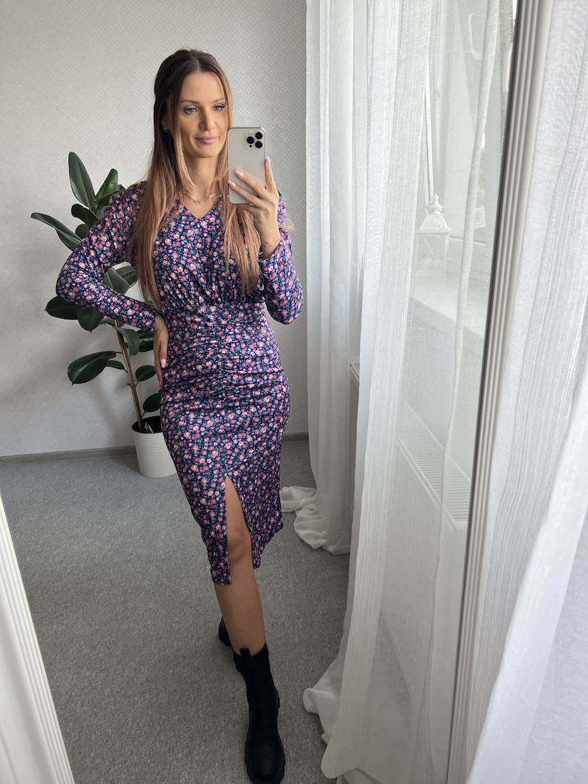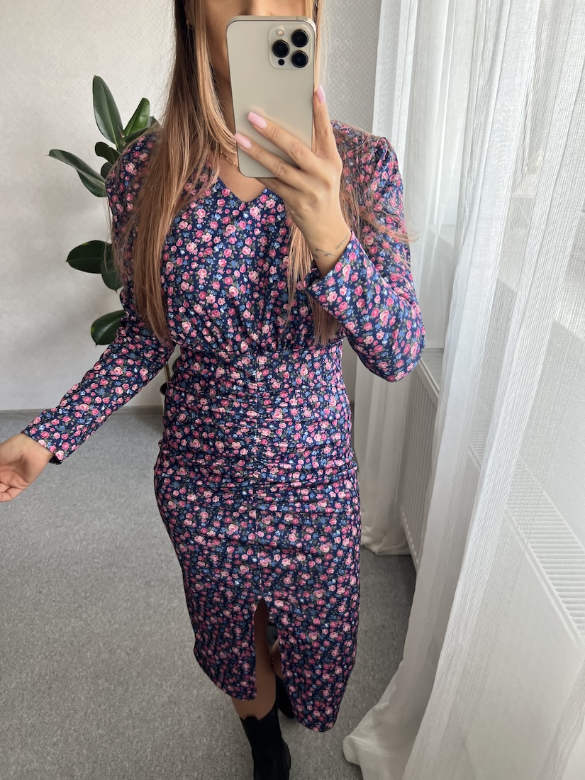 Dopasowana sukienka NORA - niebiesko różowe kwiatuszki