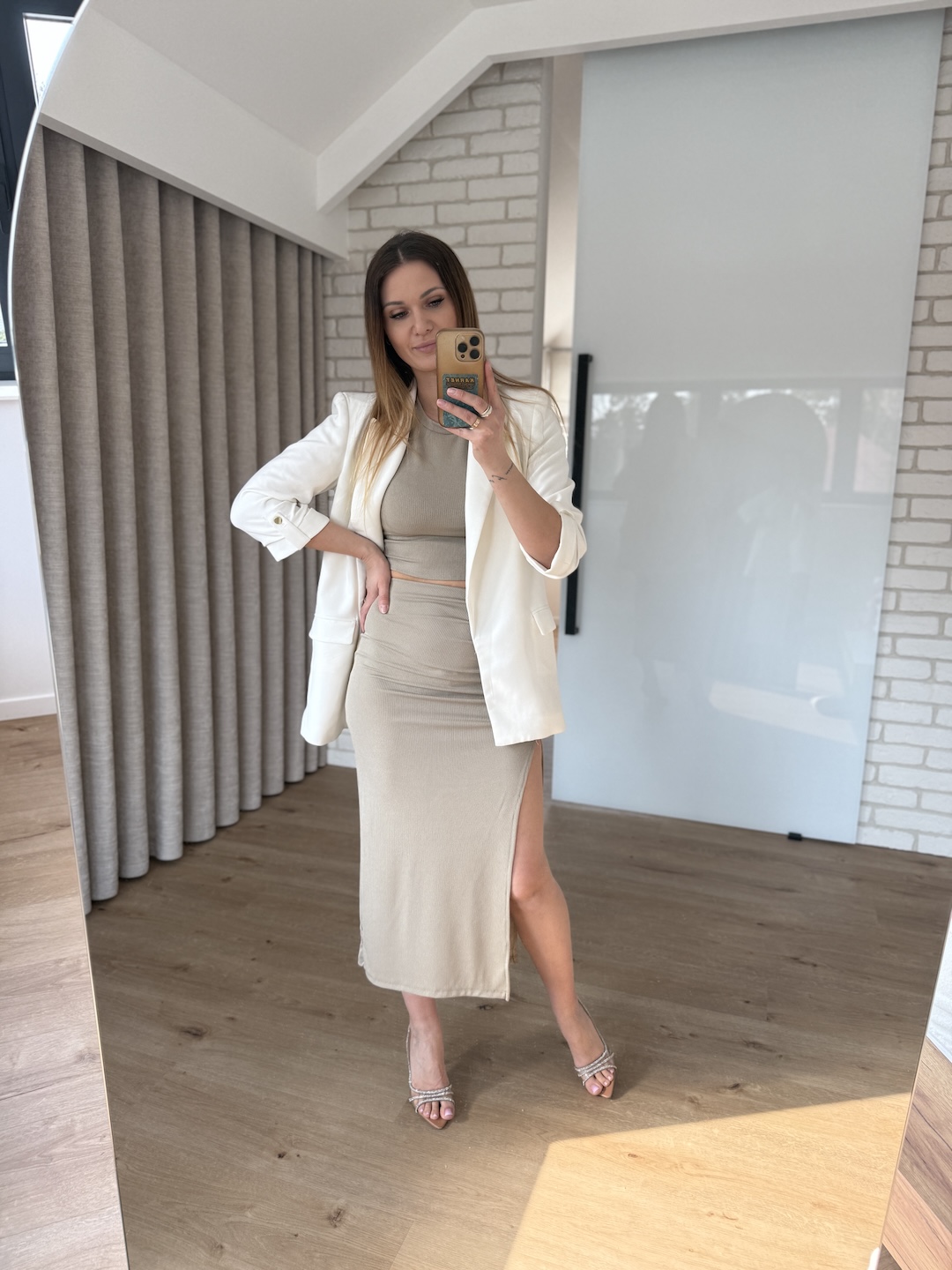 ⚠️ Ważne: przy większym brzuszku może być konieczne delikatne zeszycie rozcięcia w spódnicy, aby komplet lepiej się układał. ( modelka na zdjęciu z brzuszkiem ma zaszyte rozcięcie )