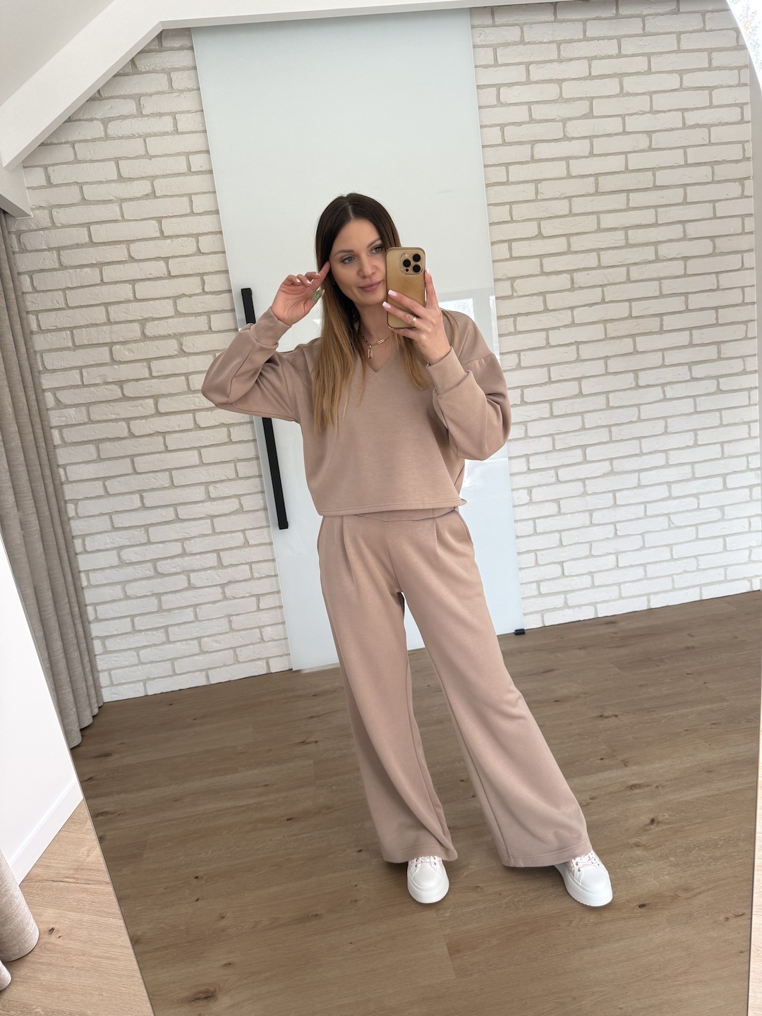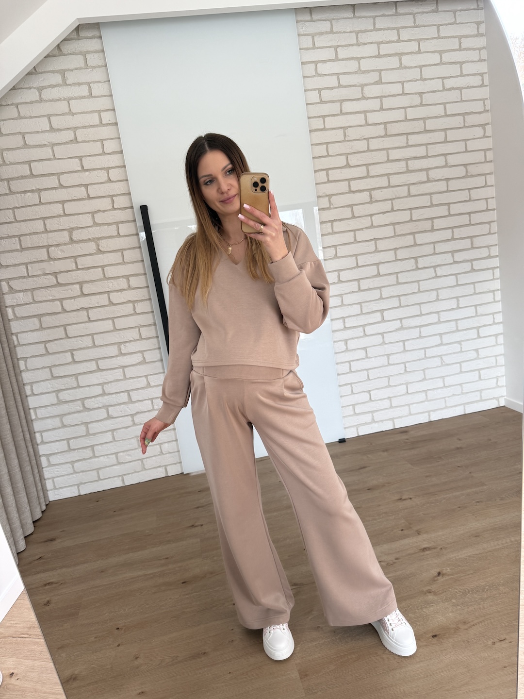 Modelka na zdjęciach z brzuszkiem ciążowym ma na sobie rozmiar M.