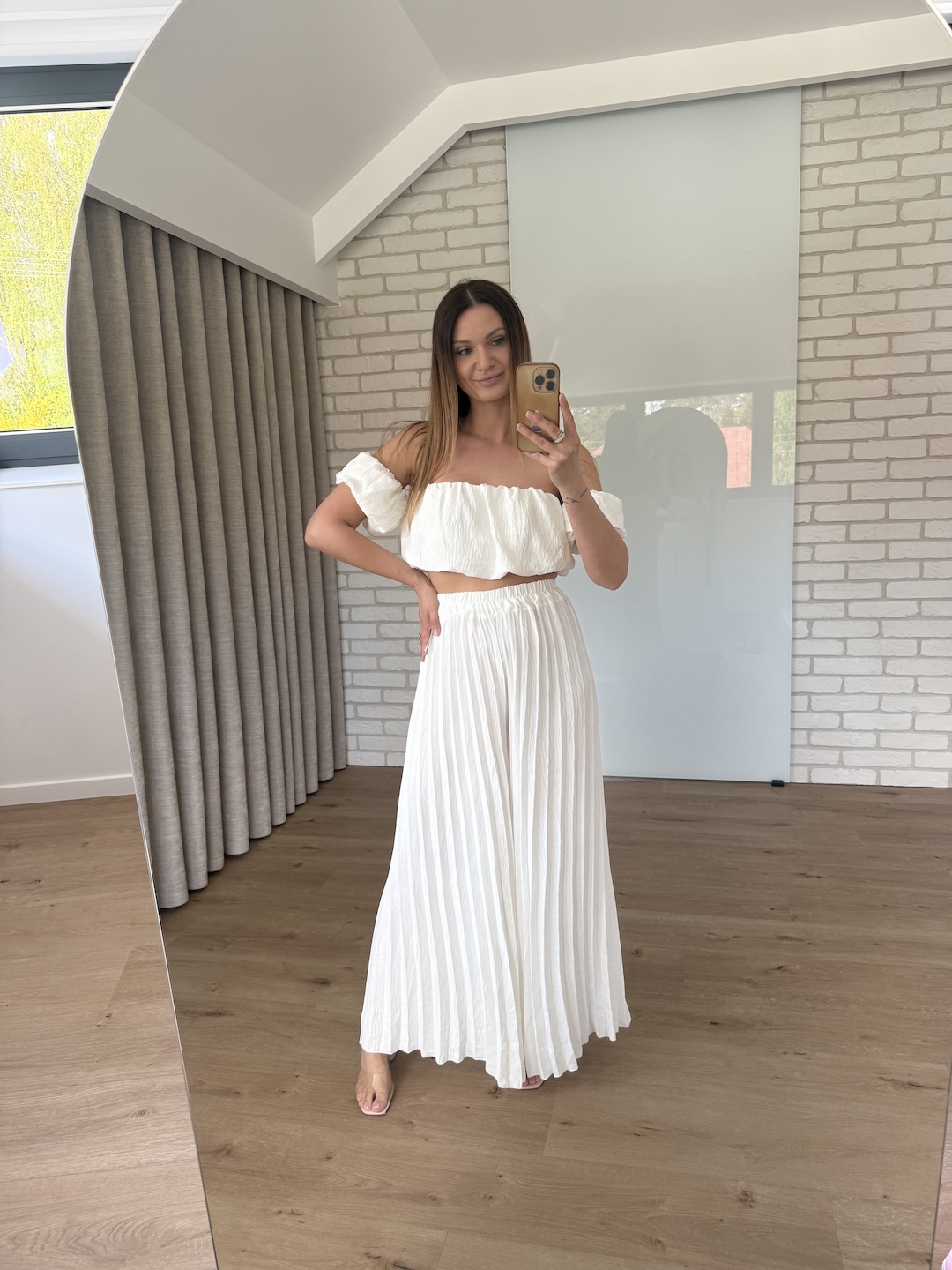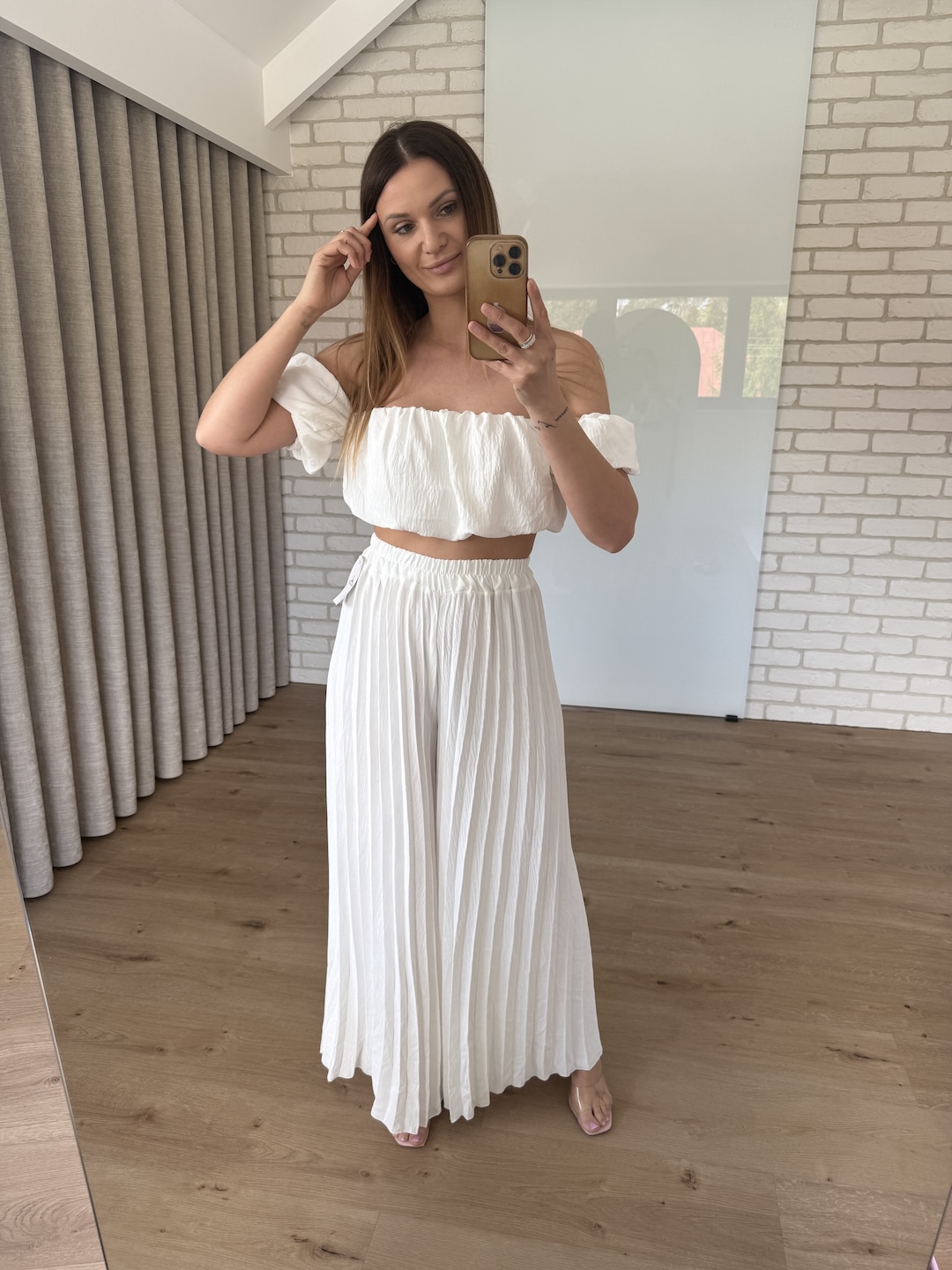 Komplet plisowany top + spodnie z wysokim stanem - biały ( wiskoza)