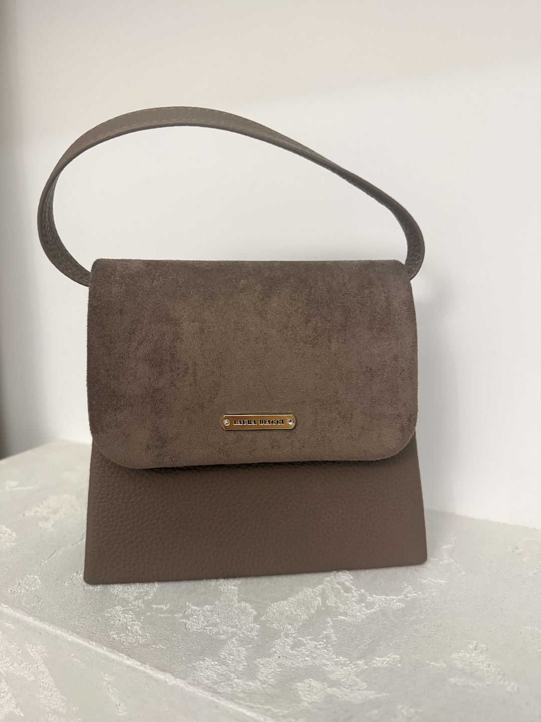 Klapa wykonana z delikatnego zamszu dodaje torebce subtelnej elegancji, a korpus z matowej skóry ekologicznej zapewnia trwałość i wygodę użytkowania. U góry znajduje się solidny uchwyt, który umożliwia noszenie torebki w dłoni lub na nadgarstku. Na froncie umieszczono złotą blaszkę z logo marki, podkreślającą jej wyjątkowy charakter.
