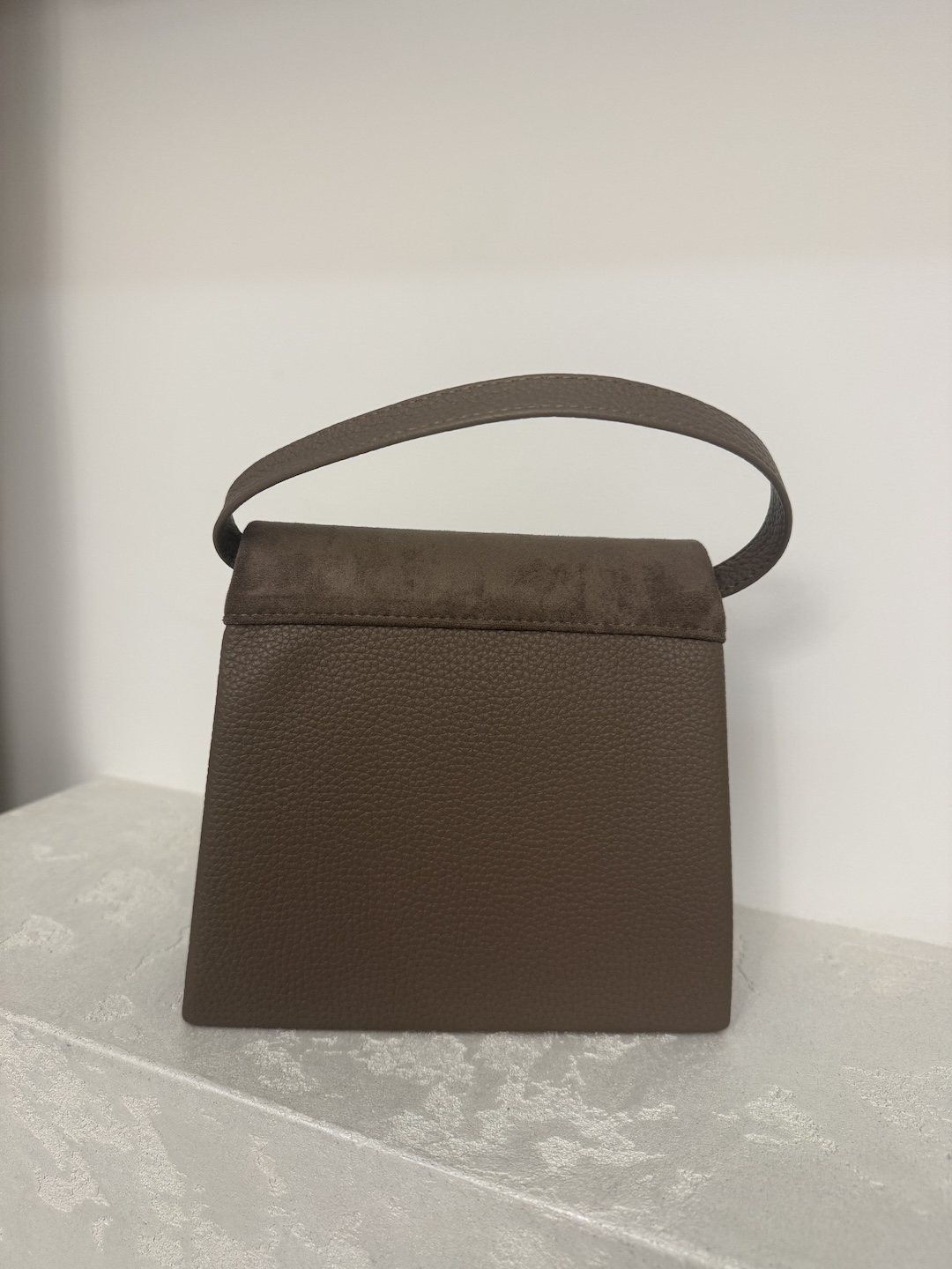 Elegancka torebka w odcieniu głębokiej café late, łącząca w sobie dwa luksusowe materiały — miękki zamsz oraz fakturowaną skórę ekologiczną. Klasyczna forma i minimalistyczny design sprawiają, że model ten doskonale uzupełni zarówno codzienne, jak i wieczorowe stylizacje.