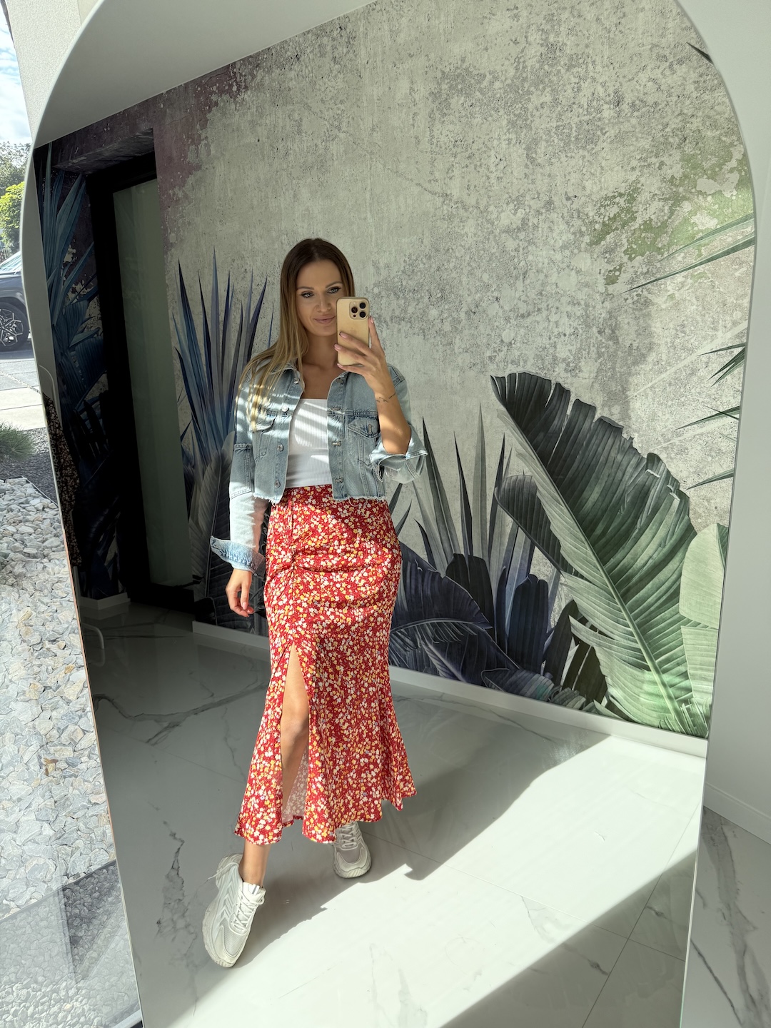 Spódnica z wiskozy - AUTUMN BLOOM - czerwona w kwiaty