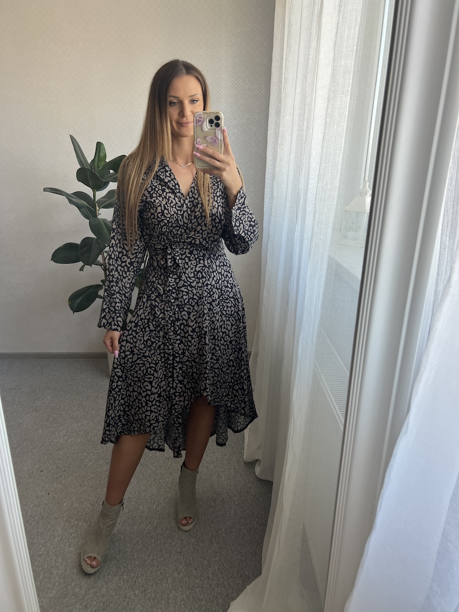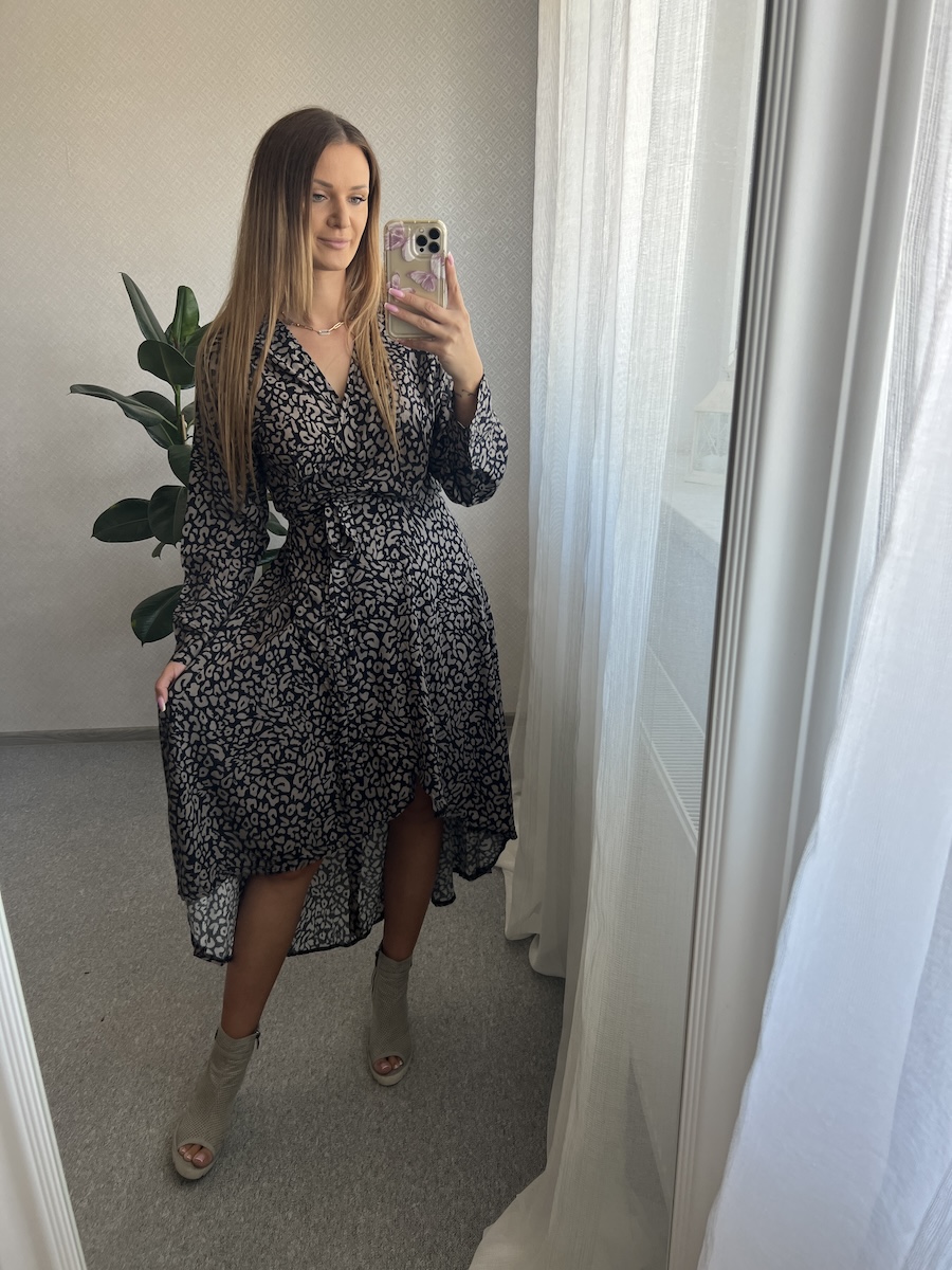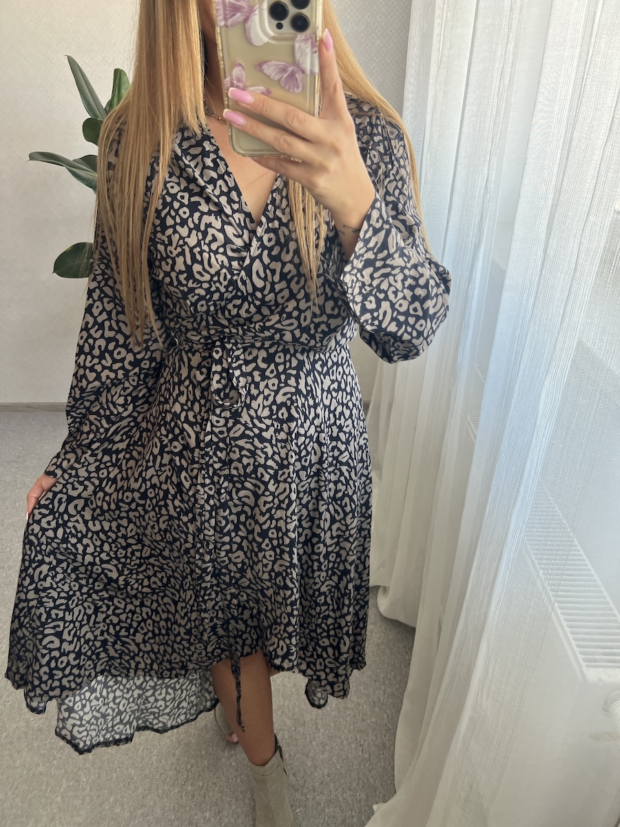 Sukienka jest wiązana na zakładkę ( jak szlafrok ) , dzięki czemu pasuje od rozmiaru 36 do 44.
