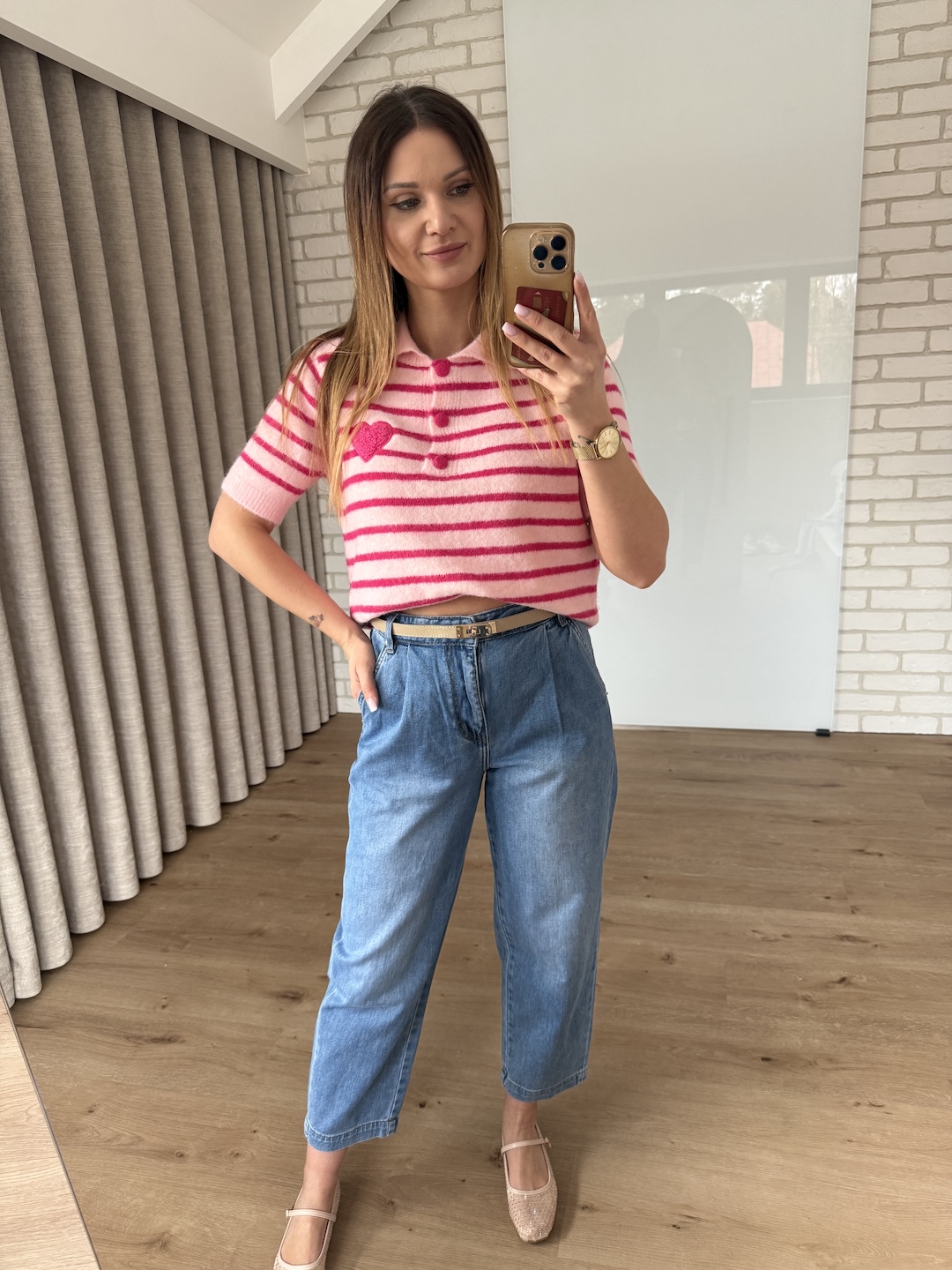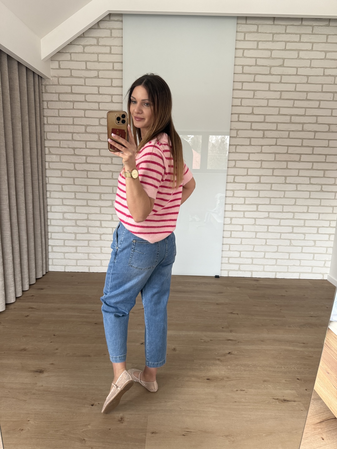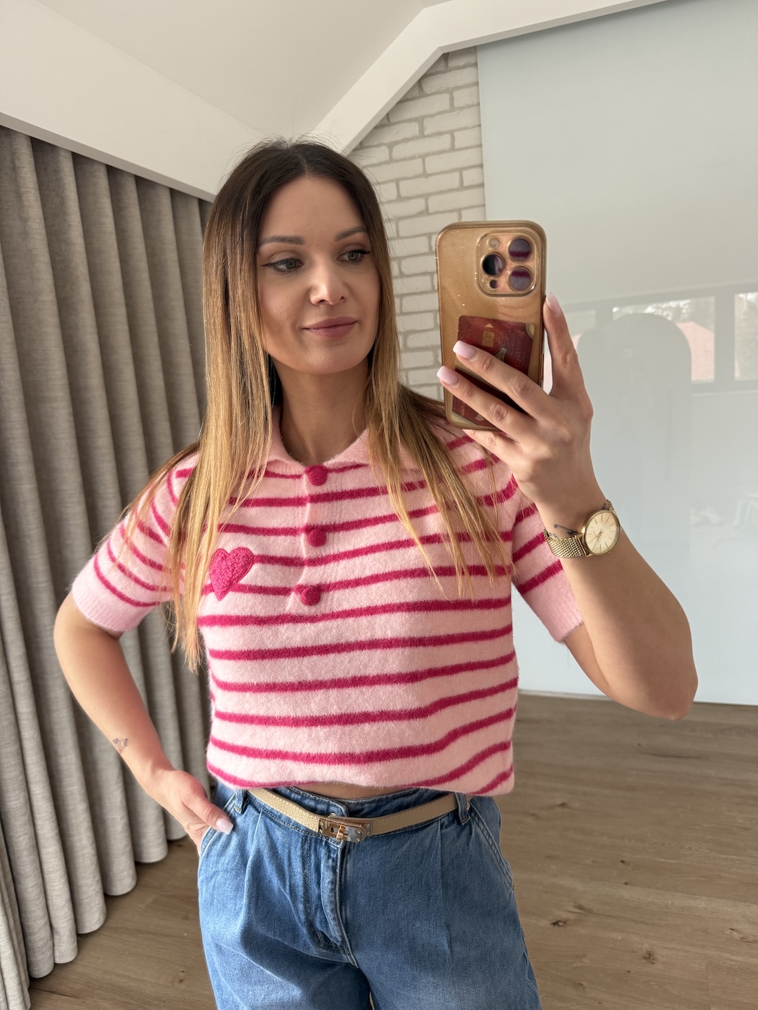Sweter w paski z krótkim rękawem - różowy